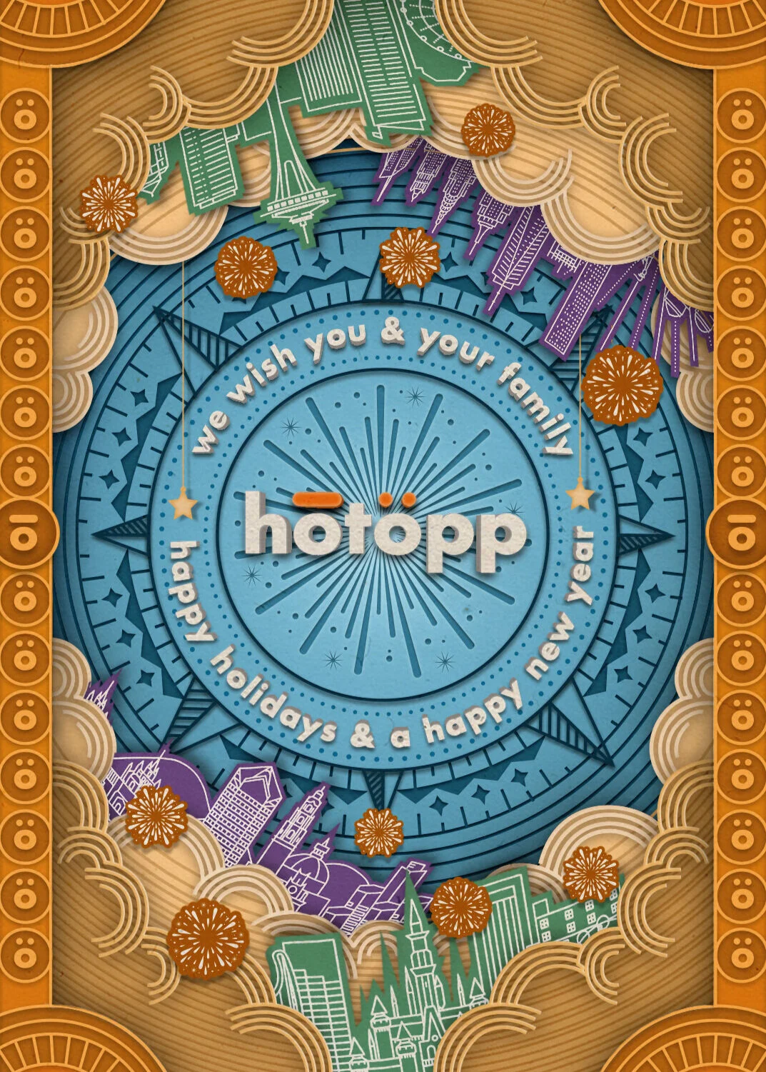 Company Holiday Card Designed to look like Colored Paper Cutouts placed one on top of the other.To feel the paper craftsmanship and portray the coming of the new year in all the locations that the company has an office. Also, to thank all the clients that made that year great for the company's growth.