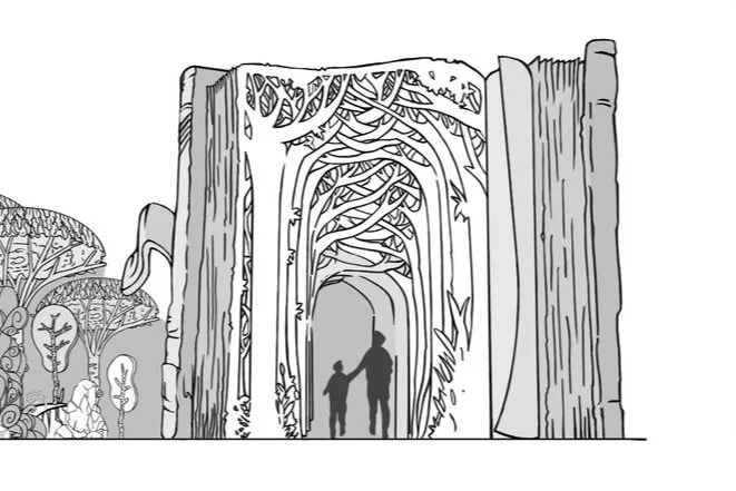 Elevation Drawing of the Facade of a Theme Park Ride Concept. A giant sized Book that has magical stories and fables of European influence. The Book turns the forest into a magical one and invites guests to venture inside of it to be part of the magic.